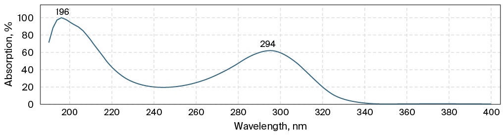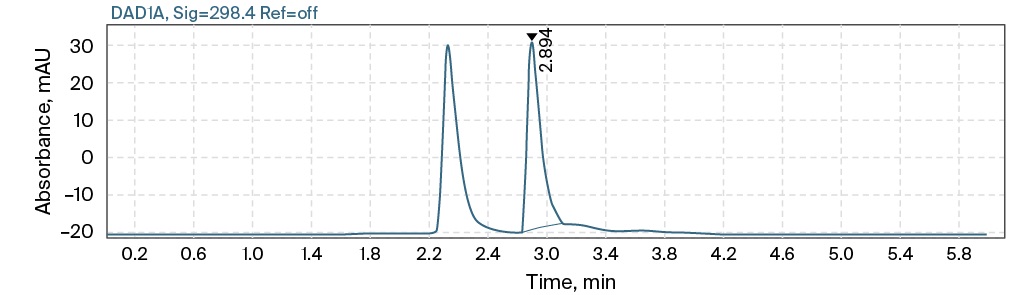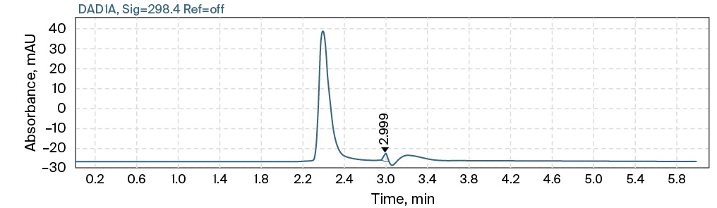 To develop the HPLC-DAD method, a chromatographic column was selected: Agilent Eclipse Plus C8, 4.5 × 150 mm in size, octasilane (C8) sorbent, 5 microns. An Eclipse Plus C18 2.1 × 12.5 mm, 5 µm protective column was used to protect the main column from biological sample related substances. The MP composition was optimized as follows: MP A 25 Mm ammonium acetate buffer pH 6.0 ± 0.1, MP B acetonitrile in a ratio of 89:11, the elution mode is isocratic. Oven temperature 30 °C, injection volume 20 µL. To select the wavelength of detection, the ultraviolet spectrum of the meropenem substance solution was recorded (Fig. 1), the obtained maximum absorption corresponded to the literature data and amounted to 298 nm. The retention time of the meropenem peak was about 3 minutes.