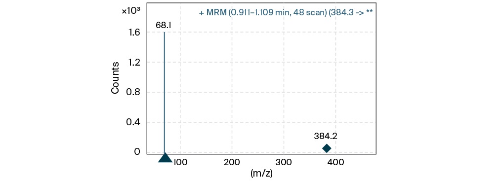 The HPLC-ESI-MS/MS method was developed on a chromatographic column for ultra HPLC “Zorbax Eclipse C18”, C18, 50 × 2.1 mm, 1.7 µm. An Eclipse Plus C18 2.1 × 12.5 mm, 5 µm protective column was used to protect the main column from biological sample related substances. The MP composition was selected as follows to obtain a positively charged parent ion of meropenem: MP A 0.1% formic acid in purified water, MP B 0.1% formic acid in acetonitrile, elution mode isocratic, solvent ratio 95:5%. Oven temperature 30 °С, injection volume 5 µL. To select the multiple reaction monitoring transition for meropenem detection, the mass spectrum was recorded and the most intense product ion 68.1 was selected (Fig. 3). ESI-MS/MS parameters were optimized to achieve the highest sensitivity of the method: precursor ion 384.2; product ion 68,1; gas temp 350 °С; gas flow 9 l/min; sheath gas flow 9 l/min; ion spray voltage 5500; collision energy 51.